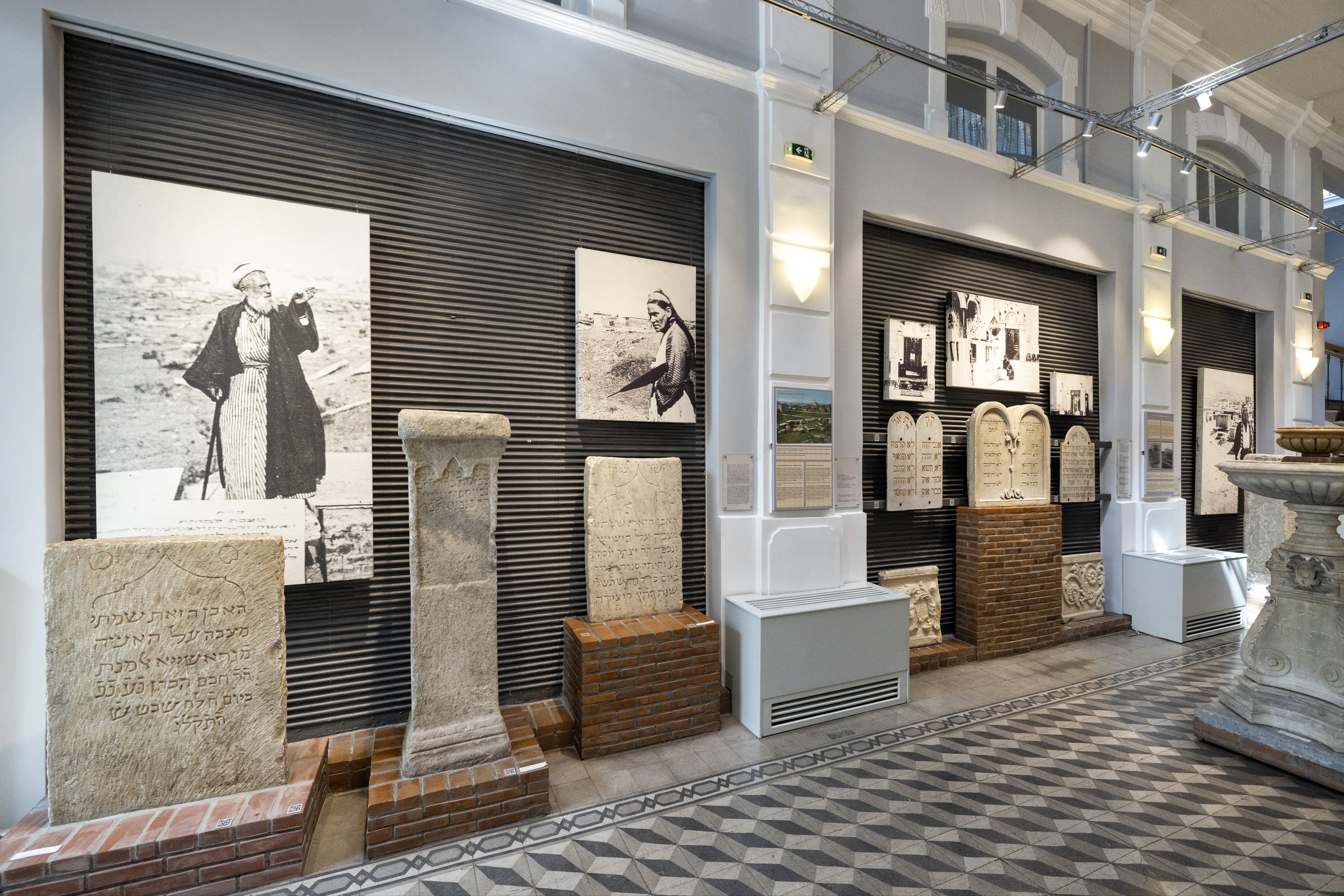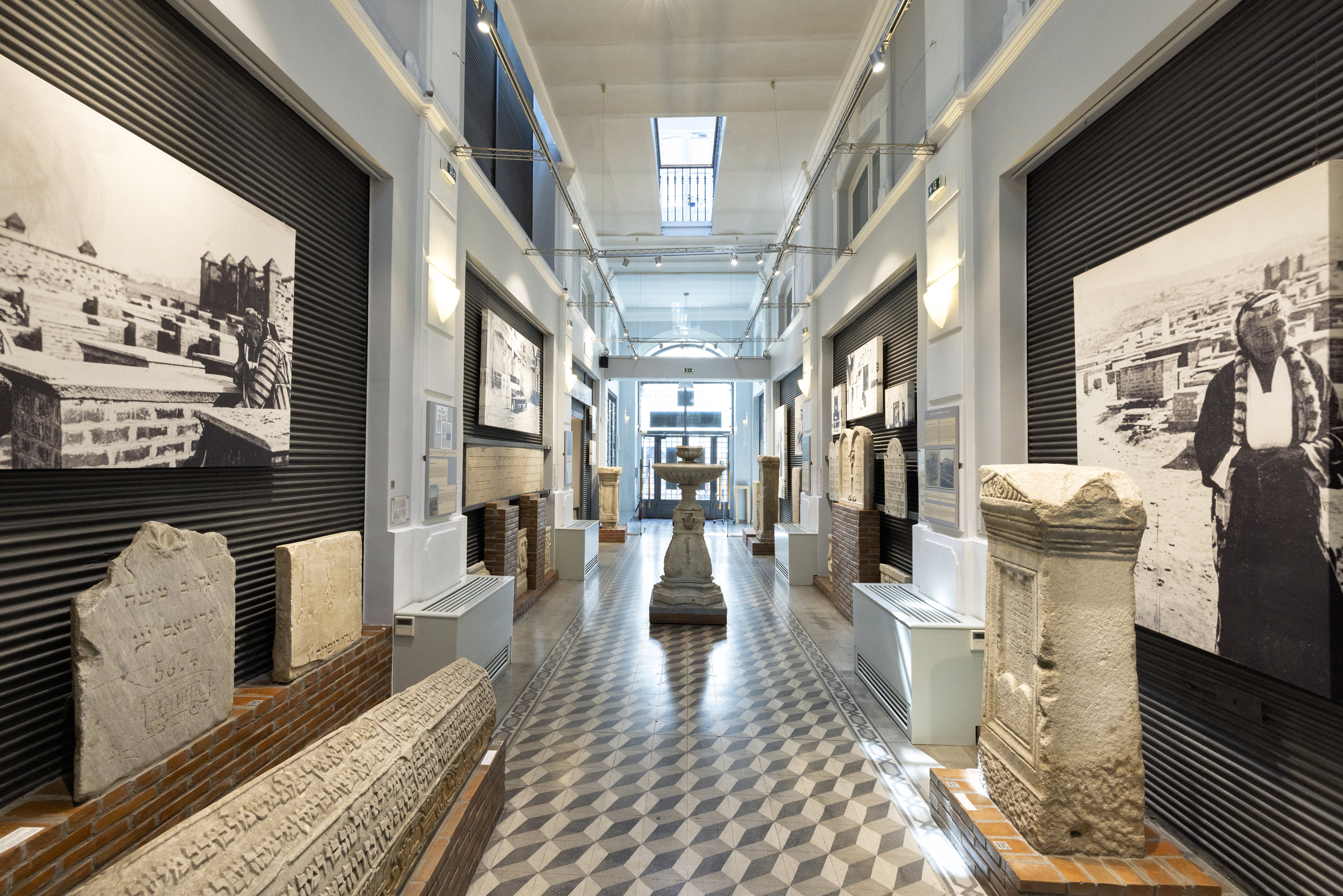 Ο εκθεσιακός χώρος του Εβραϊκού Μουσείου Θεσσαλονίκης εκτείνεται σε πολλά επίπεδα. Το ισόγειο είναι αφιερωμένο στην μακραίωνη ιστορία του αρχαίου εβραϊκού νεκροταφείου της Θεσσαλονίκης το οποίο απλωνόταν στο χώρο που σήμερα καταλαμβάνει το Πανεπιστήμιο, πριν από τον 15ο αιώνα. Η αίθουσα, επιμελημένη από τον Σταυρουλάκη, περιλαμβάνει επιτύμβιες στήλες ρωμαϊκής περιόδου αρχαιολογικής σημασίας που χρονολογούνται από τον 3ο-4ο αιώνα, οι οποίες χρησιμοποιήθηκαν ως επιτύμβιες πλάκες στο νεκροταφείο από το 1534. Στο κέντρο της αίθουσας εκτίθενται ανάγλυφες επιγραφές, μαρμάρινες πλάκες και ένα σιντριβάνι από τις ιστορικές Συναγωγές της πόλης που καταστράφηκαν κατά τη διάρκεια του Β΄ Παγκοσμίου Πολέμου. Η έκθεση συμπληρώνεται από σπάνιο φωτογραφικό υλικό που ανήκε στον Άγγλο στρατιωτικό Hugh Fawcett, ο οποίος υπηρέτησε στη Θεσσαλονίκη το 1915-1917 στη διάρκεια του Α’ Παγκοσμίου Πολέμου. Η αίθουσα με τις επιτύμβιες πλάκες και τα μαρμάρινα ανάγλυφα τεκμηριώνουν την μακραίωνη παρουσία των Εβραίων στη Θεσσαλονίκη και την πολιτισμική καταστροφή που συντελέστηκε κατά τη διάρκεια του Ολοκαυτώματος με την καταστροφή του ιστορικού εβραϊκού νεκροταφείου και των δεκάδων Συναγωγών της πόλης.